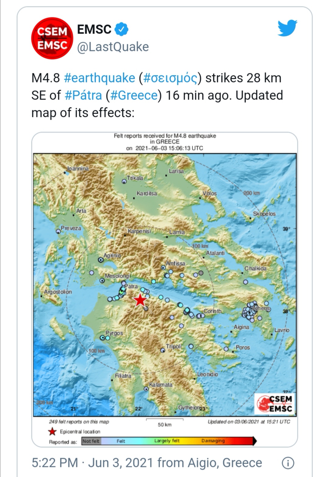 SVIJET 03 Jun, 2021 - 17:37 / Uredio: AzraS / 0 Comments Potres magnitude 4.8 u Grčkoj GRČKU je u 17:06 pogodio potres magnitude 4.8, javlja EMSC. Epicentar je bio na dubini od 38 kilometara te 15 kilometara južno od grada Aigloa i 28 kilometara jugoistočno od grada Patrasa. Za sada nema izvješća o štetama. potres Related Articles SVIJET 05 Dec, 2025 Orban: Narednih dana će se pokazati da li će se plamen rata približiti Evropi SVIJET 05 Dec, 2025 Tramp razgovarao s FIFA-om o premještanju utakmica SP-a iz gradova koje vode demokrate SVIJET 05 Dec, 2025 Ubijen Abu Shabab: Vođa proizraelske milicije stradao u Gazi pod sumnjivim okolnostima SVIJET 05 Dec, 2025 Trampova odluka o otpuštanju 250 ljudi blokirana na sudu SVIJET 04 Dec, 2025 Trump bi do Božića trebao objaviti drugu fazu plana za Gazu: Evo šta bi ona trebala podrazumijevati BOSNA I HERCEGOVINA SVIJET 04 Dec, 2025 Severe Weather | Objavljena prognoza za iduća tri mjeseca: Poznato kakva nas zima čeka u BiH