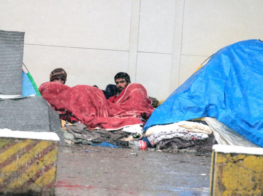Jutrošnje niske temperature i snijeg koji je napadao tokom noći stvorio je nove probleme migrantima, a posebno je uznemirujuća fotografija na kojoj se vide dva migranta koja se griju pokrivena dekama, dok leže na ledenom betonu.