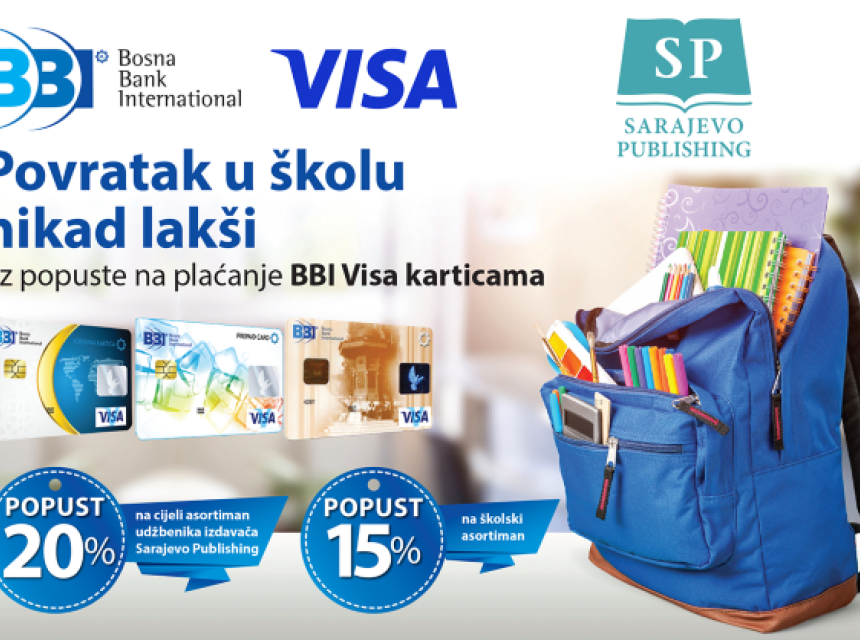 „Povratak u školu nikad nije bio lakši uz popuste na plaćanje BBI Visa karticama. Od 20. avgusta do 20. septembra ili do utroška sredstava predviđenih za popuste, korisnici BBI Visa Classic, Kupovne, Gift ili Prepaid kartica će na svim maloprodajnim mjestima Sarajevo Publishinga u ulicama: Kulovića 19, Hamze Hume 2 i Zelenih beretki 10 u Sarajevu, moći ostvariti popust od 20% na asortiman udžbenika izdavača Sarajevo Publishing, odnosno popust od 15% na cjelokupan školski asortiman. Dodatna pogodnost za korisnike BBI Visa Classic i BBI Visa kupovnih kartica je i plaćanje na rate“, saopćeno je iz Marketinga BBI banke. Minimalni iznos kupovine na koji će se obračunavati popusti iznosi 100KM, maksimalno do 1.500 KM.