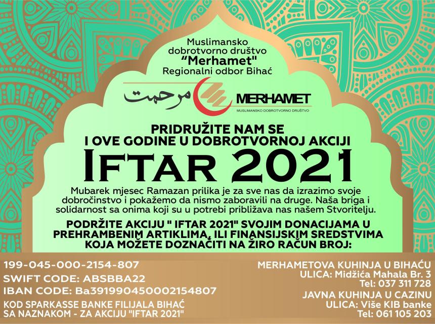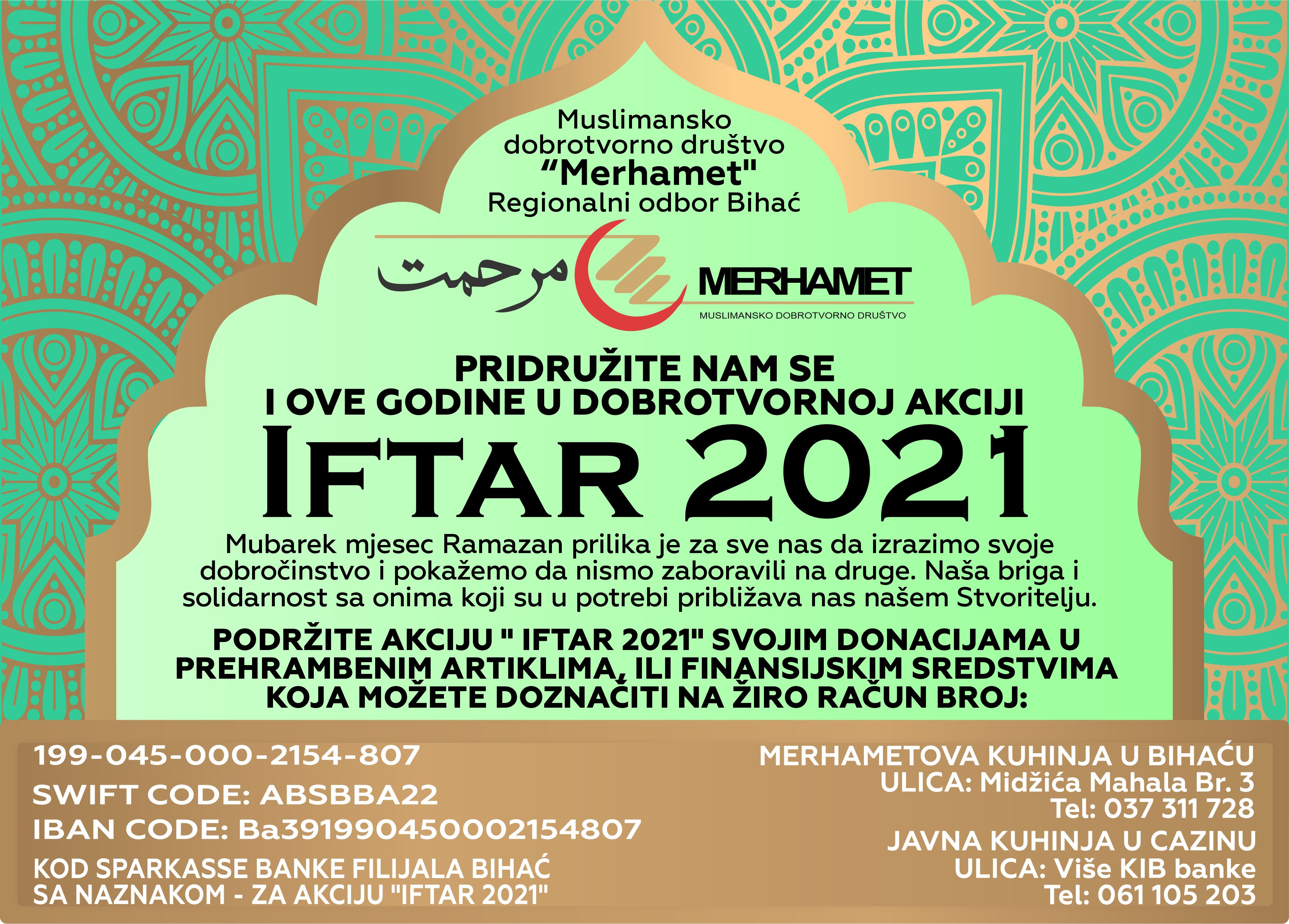 Muslimansko dobrotvorno društvo “ Merhamet “ Regionalni odbor Bihać i ove godine organizuje akciju “IFTAR 2021“ pa stoga pozivamo i Vas da se uključite u našu akciju.