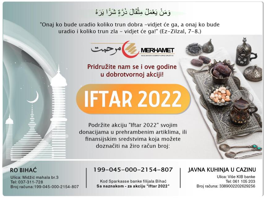 Muslimansko dobrotvorno društvo “ Merhamet “ Regionalni odbor Bihać i ove godine organizuje akciju “ IFTAR 2022 “ pa stoga pozivamo i Vas da se uključite u našu akciju.