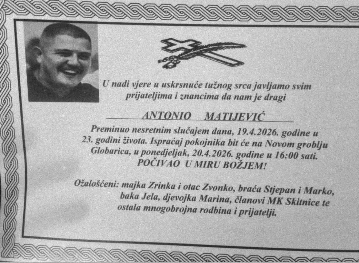 Mjesna zajednica Globarica oglasila se povodom tragične smrti mladića Antonija Matijevića, čiji je iznenadni odlazak duboko potresao lokalnu zajednicu.