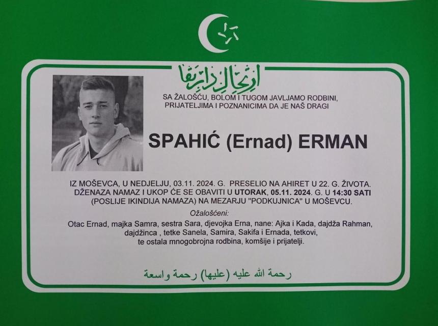 U teškoj saobraćajnoj nesreći koja se dogodila u selu Kosova kod Maglaja poginuo je Erman Spahić (22).