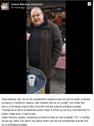 Posljednji put s Markusom, prijatelji su razgovarali u petak, a Dejanova sestra Jelena, koja živi u Beogradu, okrenula je stotine telefona kako bi ušla u trag bratu.