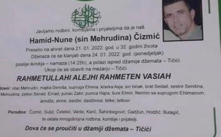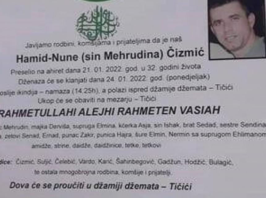 Dženaza tragično nastradalom radniku klanjat će se sutra (ponedjeljak) poslije ikindija-namaza (14:25). Ukop će se obaviti na mezarju Tičići.