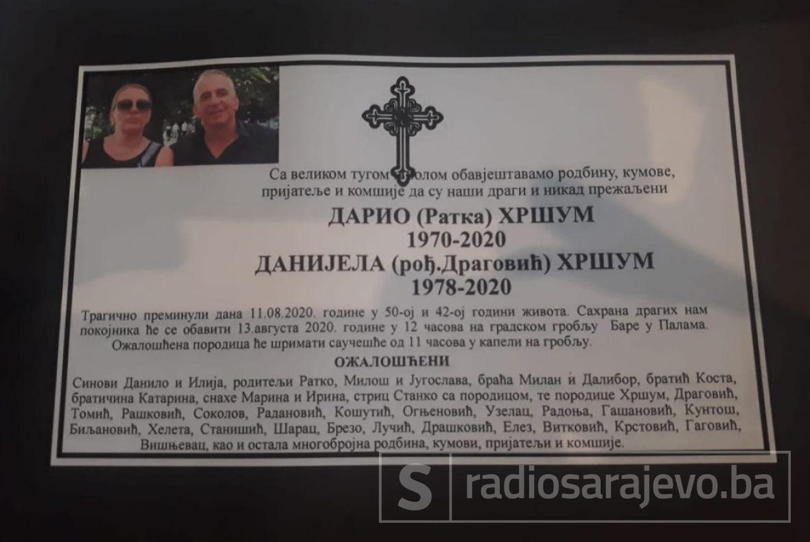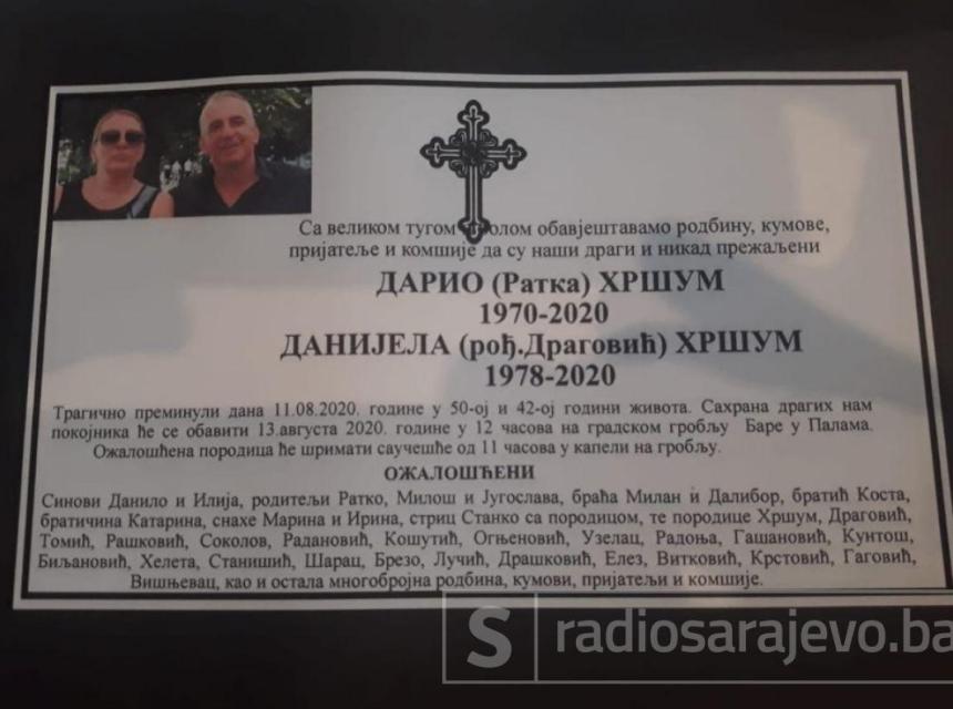 Podsjetimo, bračni par Dario i Danijela Hršum poginuli su u utorak oko 18.25 sati u saobraćajnoj nesreći koja se dogodila na dionici magistralnog puta Ljubogošta-Pale, u naselju Kalovita brda.