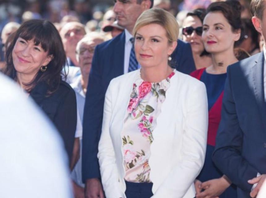 Kolinda Grabar-Kitarović pojavila se na misi u Aljmašu, povodom blagdana Velike Gospe. Kolinda je za tu prigodu odjenula tamnoplave hlače poslovnog kroja, bluzu cvjetnog uzorka te bijeli sako neobičnog uzorka na rubovima.