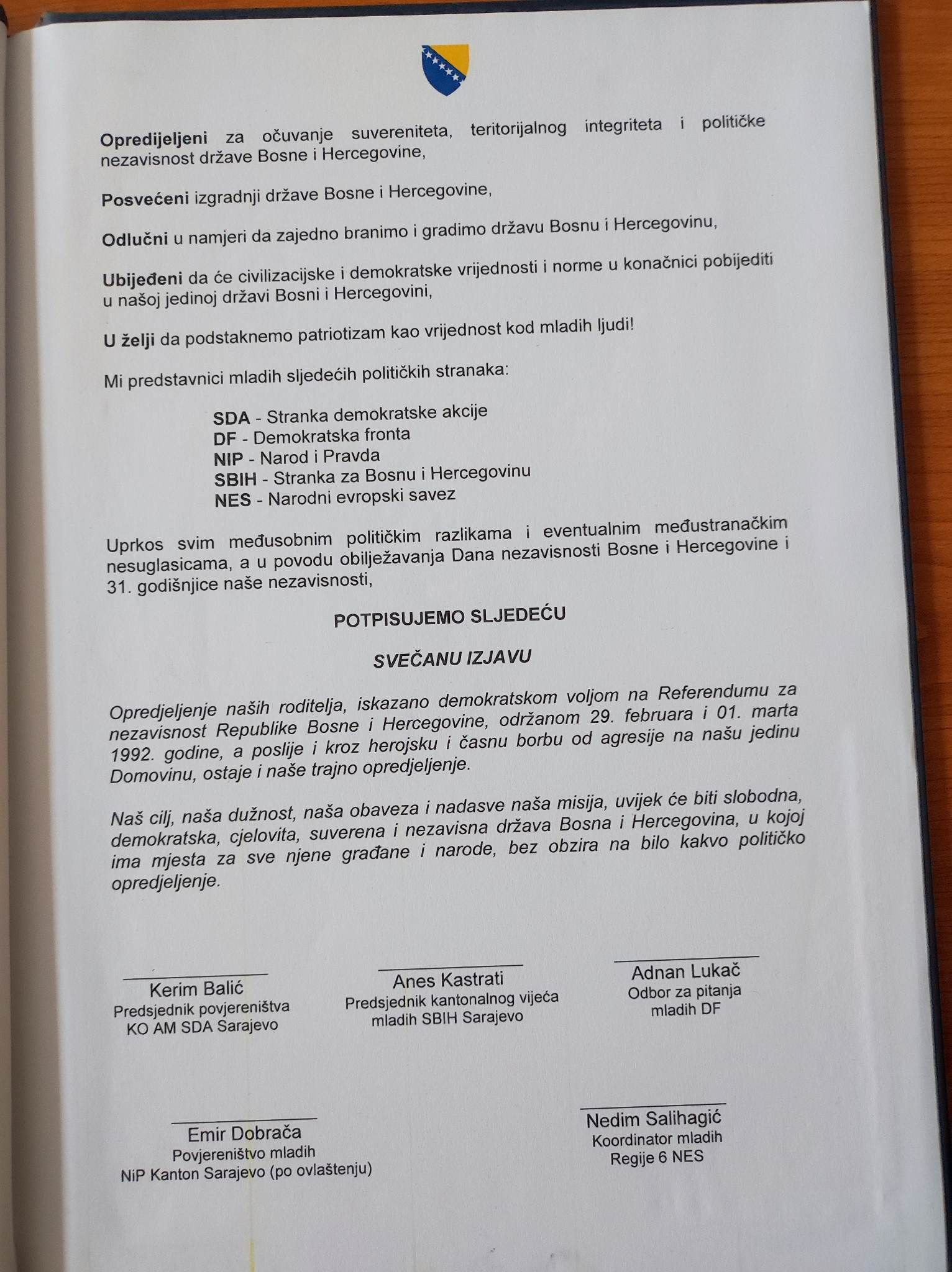 Predstavnici foruma mladih potpisali su zajedničke izjave o zajedničkoj opredjeljenosti u očuvanju i njegovanju interesa Bosne i Hercegovine.
