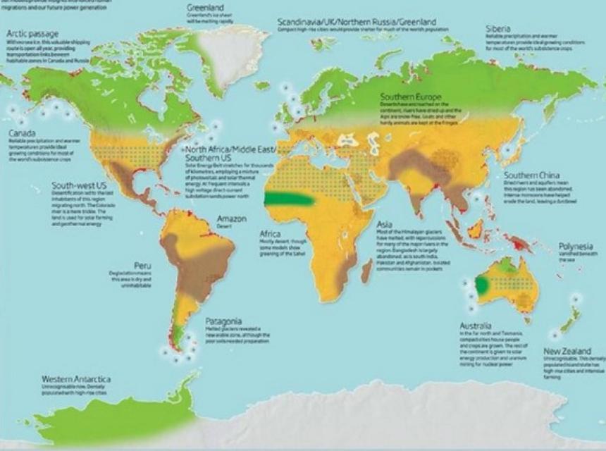 Svijetlozelenom bojom označena su područja na kojima će biti moguć uzgoj hrane i osnivanje gradova. Među njima je zapadi Antartik, sad neprepoznatljiv i gusto naseljen.