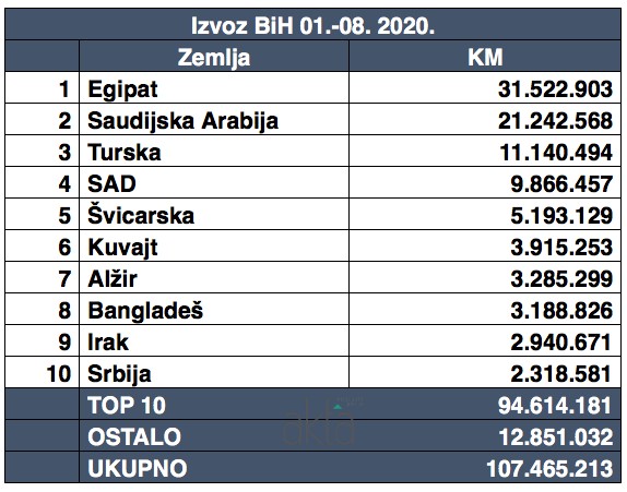 Prema podacima Vanjskotrgovinske komore BiH, najveća vrijednost izvoza ostvarena je u Egipat, i to u vrijednosti od 31,5 miliona KM.