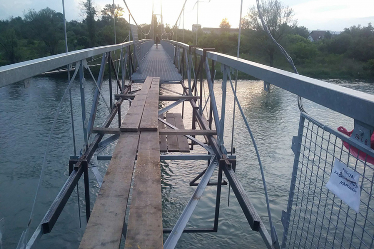Mještani banjalučkih naselja Priječani i Zalužani rizikuju i na svoju odgovornost idu preko visećeg mosta, čija je sanacija u toku, i preko klimavih dasaka prelaze na drugu stranu rijeke Vrbas, uprkos opasnosti i činjenici da se na ogradi nalazi kabl koji je pod naponom.