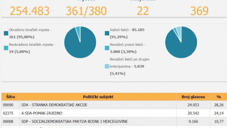 Prema do sada obrađenim podacima Centralne izborne komisije (CIK) BiH, na 95 posto obrađenih biračkih mjesta u Unsko-sanskom kantonu, SDA je osvojila 24.053 glasa ili 28,26 posto, A-sda 20.542 glasa ili 24,14 posto, a potom slijedi SDP sa 9.166 glasova ili 10,77 posto, Laburisti BiH sa 6.847 glasova ili 8,05 posto, te SBB sa 6.350 osvojenih glasova, odnosno 7,46 posto.