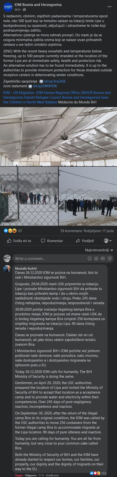 “Danas 26.12.2020 IOM se poziva na humanost. Isto to radi i Ministarstvo sigurnosti BiH. Gospodo, 20.04.2020 vlasti USK pripremile su lokaciju Lipe i pozvale Ministarstvo sigurnosti BiH da prihvate tu lokaciju kao prihvatni kamp i da u okviru svojih nadležnosti obezbjede vodu i struju. Preko 245 dana čistog nehajstva, nepoduzimanja, nesposobnosti i nerada. 30.09.2020 poslije vraćanja ilegalnog kampa Bira u prvobitno stanje, IOM je pozvan od strane vlasti USK da iz bivšeg ilegalnog kampa Bira izmjesti 256 kontejnera za smještaj migranata na lokaciju Lipa. 90 dana čistog nerada i nepoduzimanja. Danas se pozivate na humanost. Daleko ste svi od humanosti, ali jako blizu vašem zajedničkom kolaču zvanom Bira. I Ministarstvo sigurnosti BiH i IOM počnite već jednom poštovati naše domove, naše porodice, našu imovinu, naše dostojanstvo a i dostojanstvo migranata na njihovom putu u EU” – stoji u komentaru Mustafe Ružnića na Objavi IOM-a Bosne i Hercegovine.