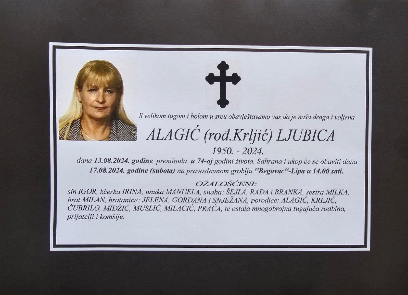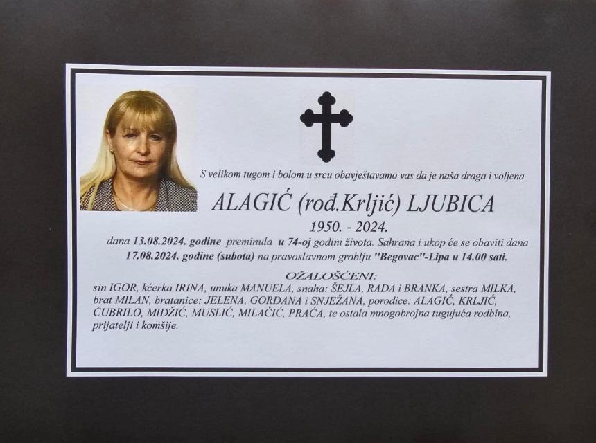 Sahrana i ukop će se obavoto dana 17.08.2024 godine na pravoslavnom groblju "Begovac"-Lipa u 14:00sati.