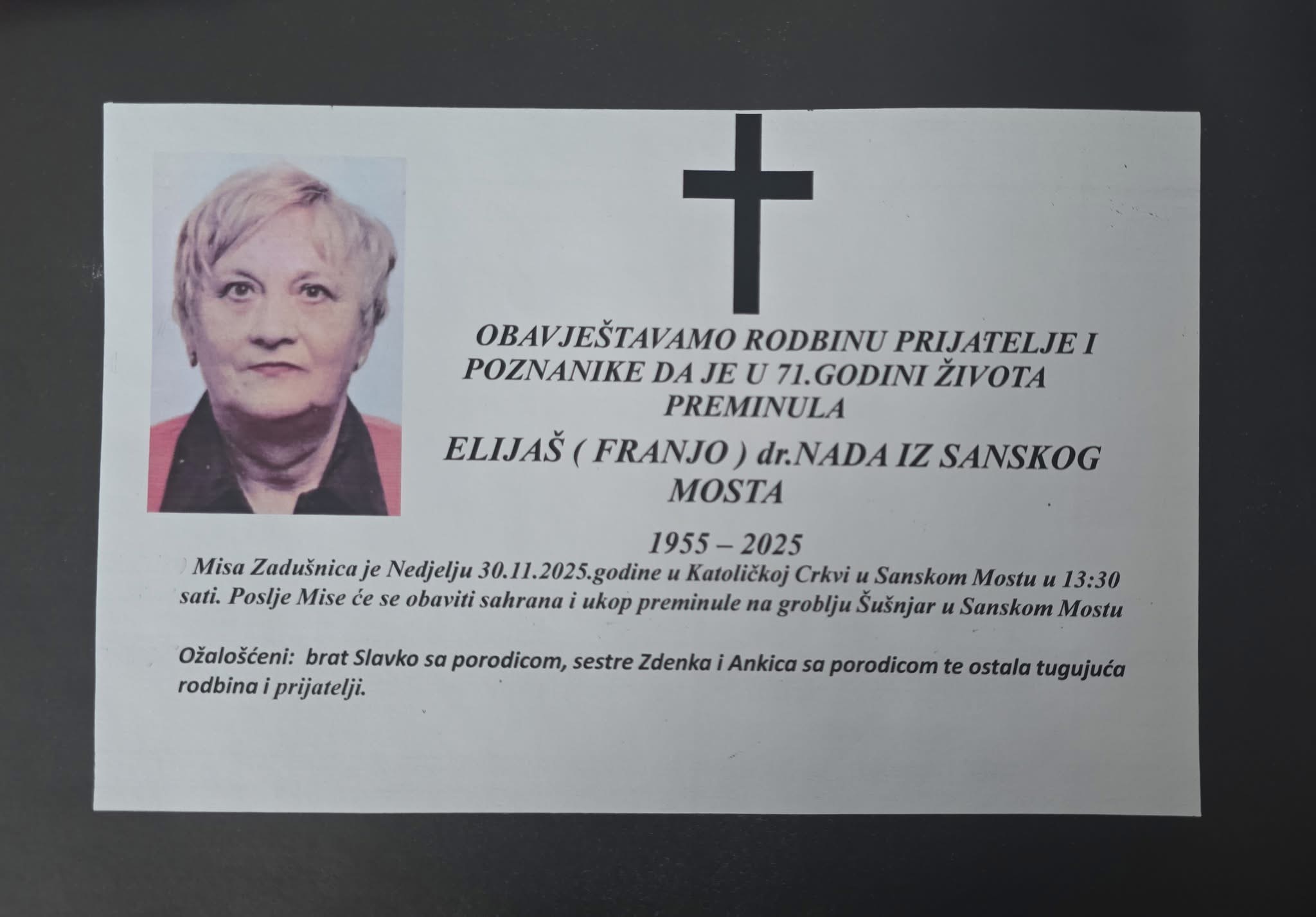 Komemorativna sjednica doktorici Nadi Elijaš biće održana u nedjelju, 30. novembra 2025. godine, s početkom u 12:00 sati u prostoru Gradskog kina u Sanskom Mostu.