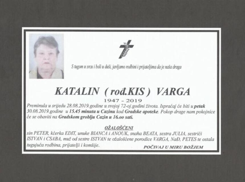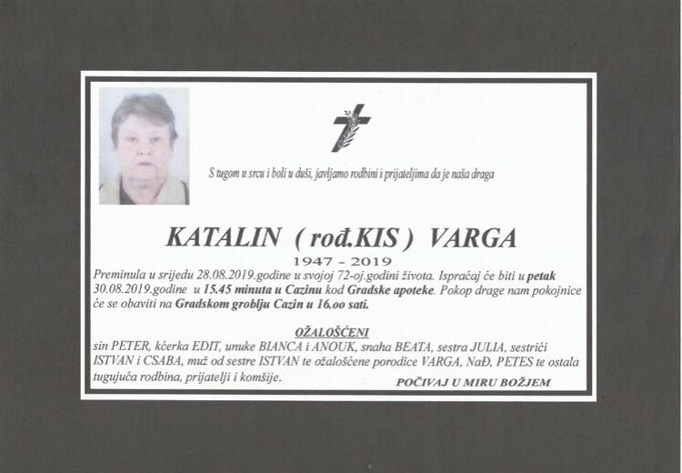S tugom i boli u duši, javljamo rodbini i prijateljima da je naša draga Katalin (rođ. Kis) Varga preminula u srijedu 28.08.2019.godine u svojoj 72.-oj godini života.