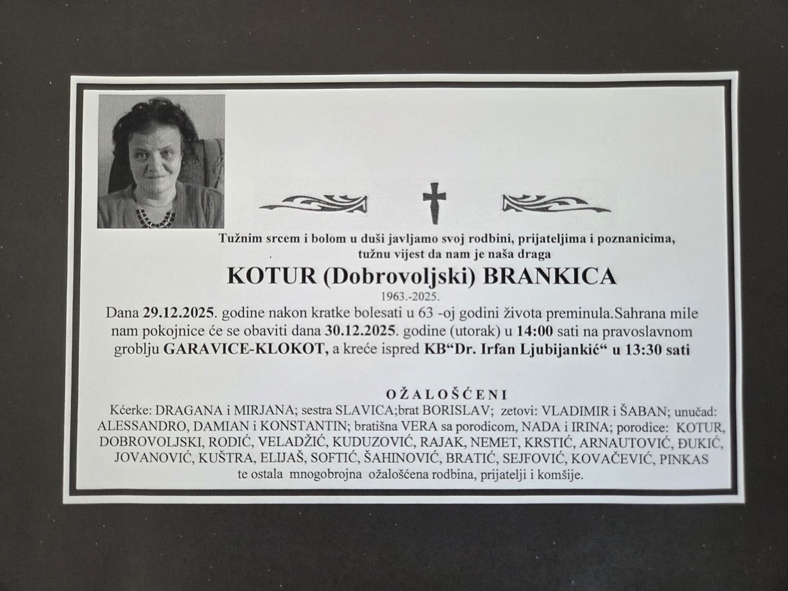 Sahrana mile nam pokojnice će se obaviti dana 30.12.2025. godine (utorak) u 14:00 sati na pravoslavnom groblju GARAVICE – KLOKOT, a kreće ispred KB „Dr. Irfan Ljubijankić“ u 13:30 sati.