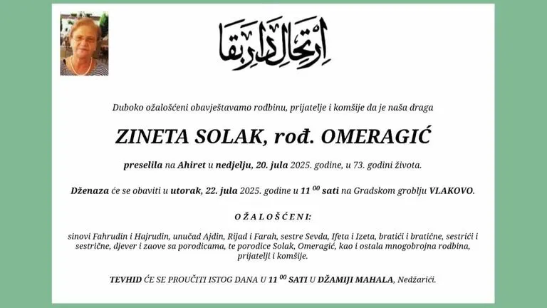 Majka Fahrudina Solaka, Zineta Solak rođena Omerović, preselila je u 73. godini na bolji svijet. Ova vijest je objavljena na Facebook profilu njenog sina Fahrudina koji je trenutno u zatvoru u Vojkovićima.