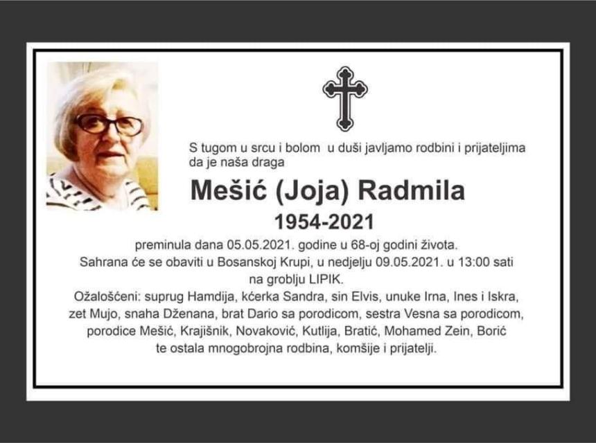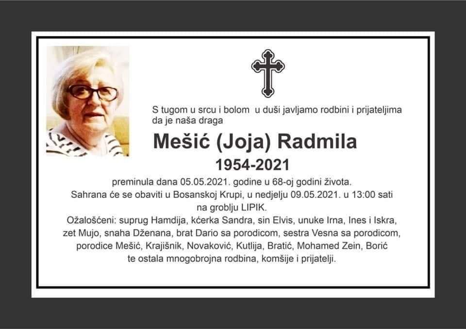 Tužnog srca i s bolom u duši obavještavamo rodbinu, komšije i prijatelje da je naša draga Mešić (Joja) Radmila preminula dana 05.05.2021. godine u 68. godini. Sahrana i ukop će se obaviti u nedjelju, u Bosanskoj Krupi, 09.05.2021. na groblju Lipik u 13:00 sati.