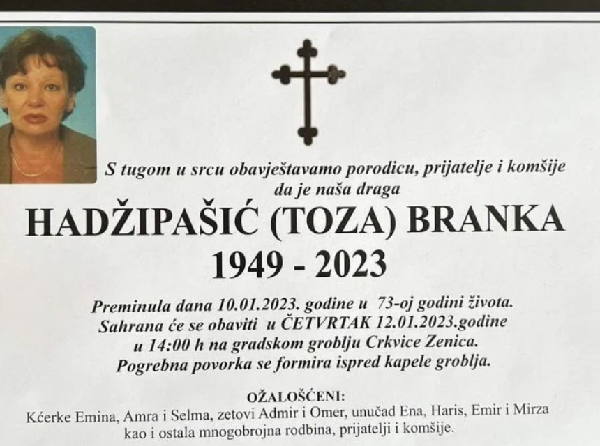 Vijest je na društvenim mrežama podijelio njen zet Omer Čevra, inače bivši portparol SBB-a. Sahrana će se obaviti sutra na Gradskom groblju Crkvice u zenici.