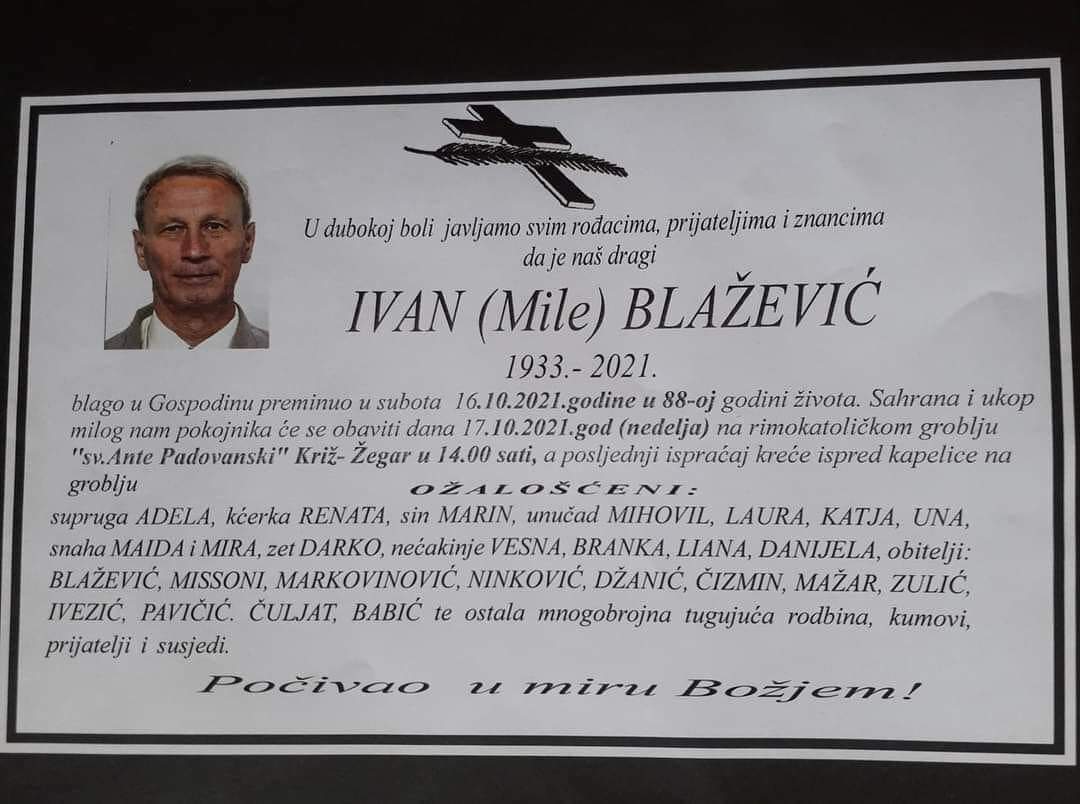 Tužnog srca i s bolom u duši obavještavamo rodbinu, komšije i prijatelje da je naš dragi Ivan (Mile) Blažević preminuo dana 16.10.2021. godine u 88. godini. Sahrana i ukop će se obaviti u nedjelju 17.10.2021. na rimokatoličkom groblju Sv. Ante Padovanski Križ-Žegar u 14:00 sati, a posljednji ispraćaj kreće ispred kapelice na groblju.