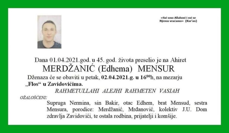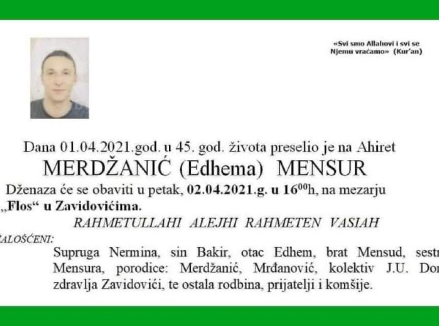 Dženaza će se obaviti u petak (sutra) u 16h na mezarju Flos u Zavidovićima.