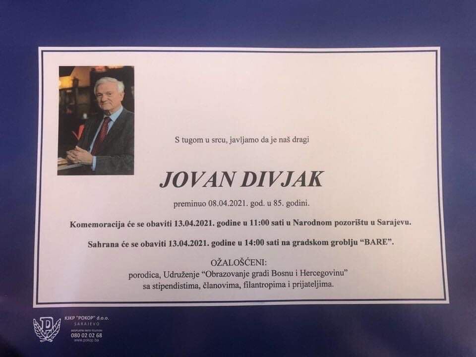S tugom u srcu , javljamo da je naš dragi Jovan Divjak preminuo 08.04.2021. god. u 85. godini