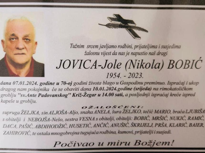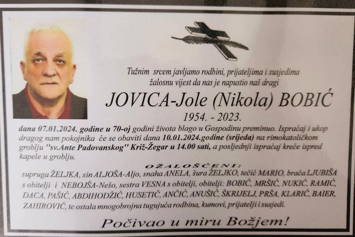 Tužnim srcem javljamo rodbini, prijateljima i susjedima žalosnu vijest da nas je napustio naš dragi Jovica - Jole (Nikola) Bobić dana 07.01.2024. godine u 70. godini života.