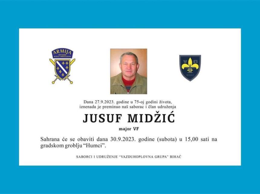 OBAVIJEST O SMRTI 30 Sep, 2023 - 11:31 / Uredio: Sureja / 0 Comments Preminuo Jusuf Midžić Dana 27.9.2023. godine u 75-oj godini života, iznenada je preminuo naš saborac i član udruženja Jusuf Midžić. Sahrana će se obaviti dana 30.9.2023. godine (subota) u 15h na gradskom groblju "Humci". obavijest o smrti Related Articles OBAVIJEST O SMRTI 17 Dec, 2025 Na Ahiret preselio Arslanović (Jasim) Halid OBAVIJEST O SMRTI 16 Dec, 2025 Na Ahiret preselio ELJAZOVIĆ (Fehima) SEAD OBAVIJEST O SMRTI 16 Dec, 2025 Na Ahiret preselila Mujagić Nafija, rođ. Alešević OBAVIJEST O SMRTI 16 Dec, 2025 Na Ahiret preselila Begić (Muhamed) Aida OBAVIJEST O SMRTI 16 Dec, 2025 Na Ahiret preselio Ćoralić (Omer) Hazim, ef. OBAVIJEST O SMRTI 16 Dec, 2025 Na Ahiret preselila Mujić (Mumin) Fikreta, rođ. Salihović