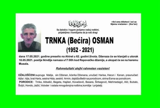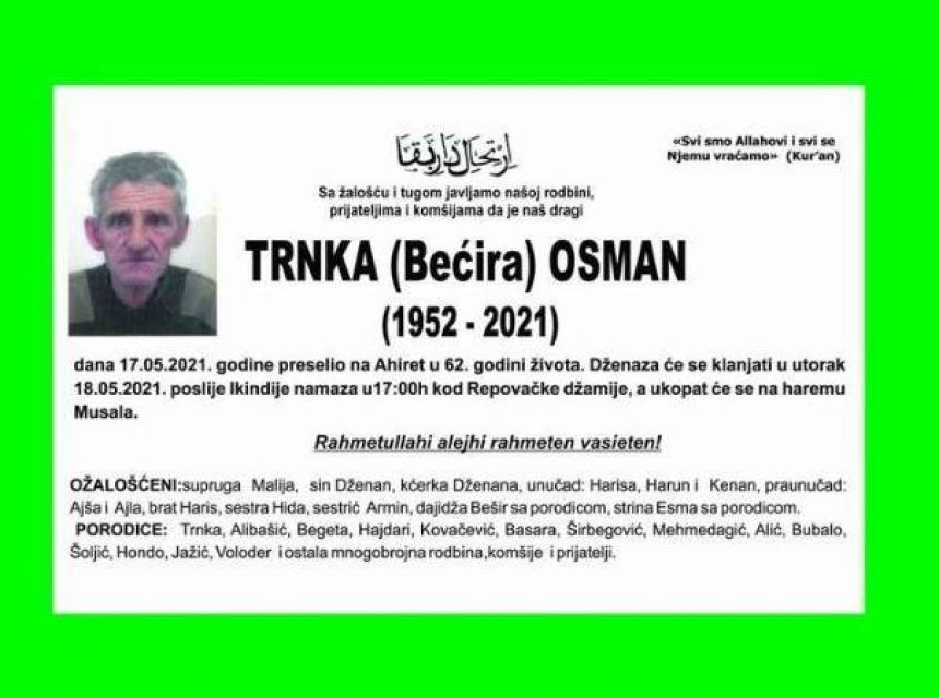 Dženaza rahmetli Osmanu Trnki klanjat će se u utorak, 18. maja, poslije ikindije-namaza kod Repovačke džamije, a ukopat će se u haremu Musala u Konjicu.