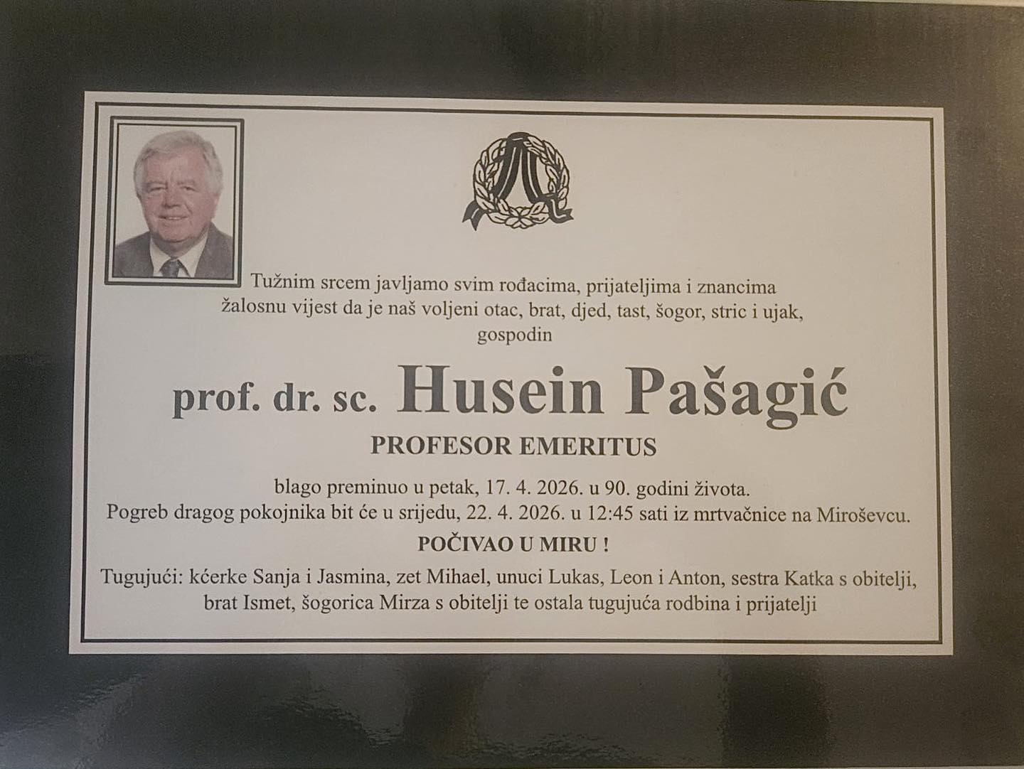Tužnim srcem javljamo svim rođacima, prijateljima i znancima žalosnu vijest da je naš voljeni otac, brat, djed, tast, šogor, stric i ujak, gospodin prof. dr. sc. Husein Pašagić PROFESOR EMERITUS blago preminuo u petak, 17. 4. 2026. u 90. godini života.
