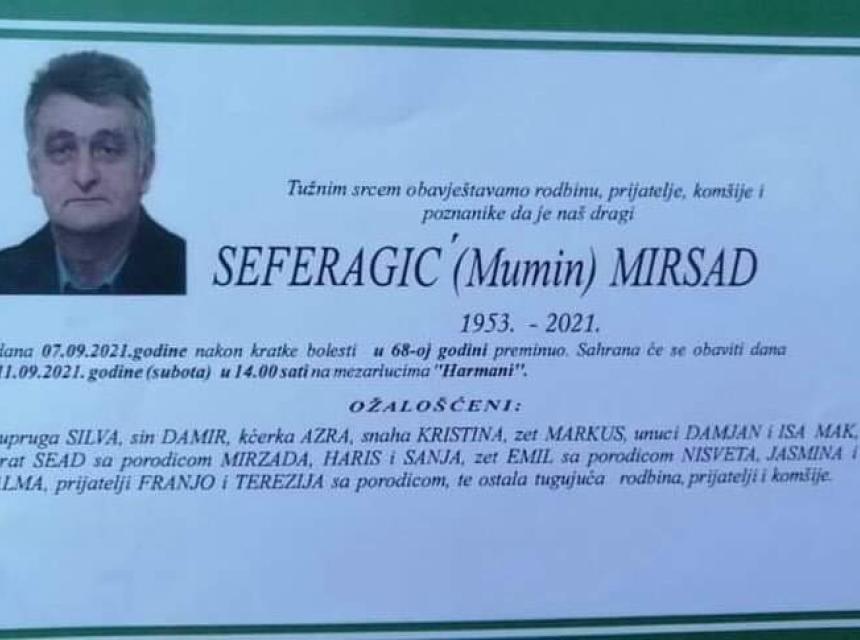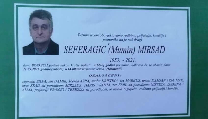 Tužnog srca i s bolom u duši obavještavamo rodbinu, komšije i prijatelje da je naš dragi Seferagić (Mumin) Mirsad, dana 07.09.2021. godine, u 68-oj godini života preminuo.