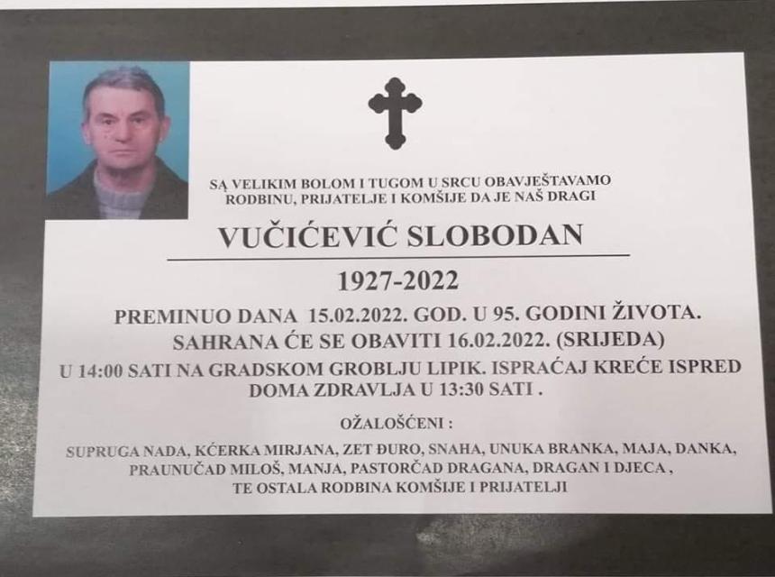 Svelikim bolom i tugom u srcu obavještavamo rodbinu, prijatelje i komšije, da je naš dragi Vučićević Slobodan, preminuo dana 15.02.2022. godine, u 95-oj godini života.