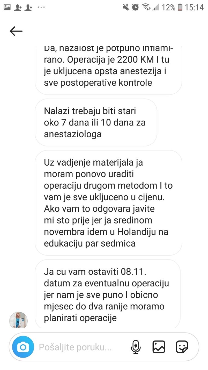 “Da, nažalost je puno inflamirano. Operacija je 2.200 maraka i tu je uključena opšta anestezija i sve postoperativne kontrole”, napisala je majci dr Jovanović.