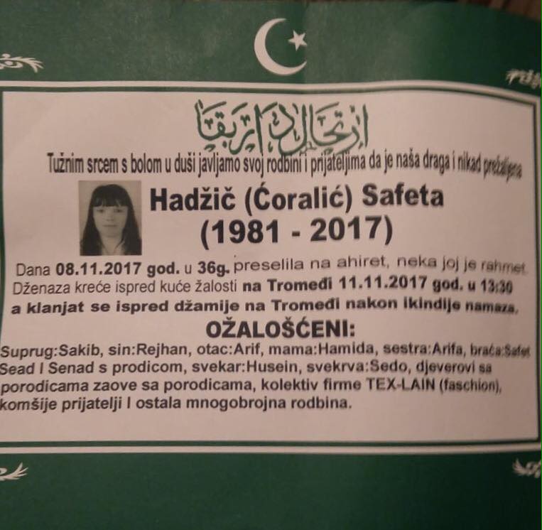 Tužnim srcem i bolom u duši javljamo svoj rodbini i prijateljima da je naša draga i nikad prežaljena Hadžič ( rođ. Ćoralić) Safeta dana 08.11. 2017. godine u 36-oj godini života preselila na Ahiret.