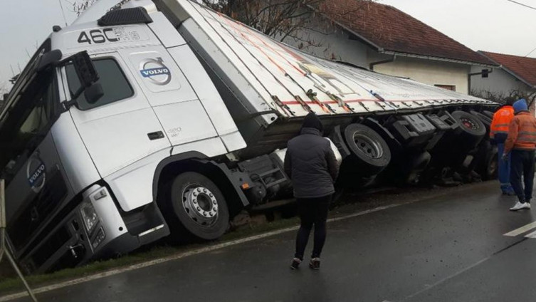 Kamion je prevozio 19 tona tekstila, a 44-godišnji vozač kaže da je tokom mimoilaženja desnim točkovima uhvatio bankinu i sletio u jarak, a zatim se zabio u betonski putni prilaz kod kuće s brojem 95.