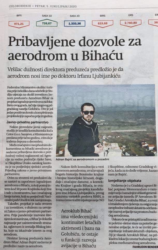- Nakon širih konsultacija u vezi s imenom aerodroma, uvažavajući bogatu historiju Bosanske krajine i brojne historijske ličnosti, događaje i značajne datume, u kontekstu Krajine i grada Bihaća, te ovakvog značajnog projekta kandidujem ime Irfana Ljubijankića, prvog ministra vanjskih poslova RBiH, o čemu ćemo tražiti izjašnjavanje NO i Skupštine, odnosno Gradskog vijeća, kada za to dođe vrijeme, kazao nam je Bajrić.