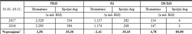 U tablici ispod dajemo prikaz ukupno raspoređenih sredstava entitetima i Distriktu Brčko BiH sa pripadajućim spoljnim dugom u periodu 01.01.-30.11.2017. godine u poređenju sa istim periodom prošle godine. Svi iznosi su iskazani u milionima KM.