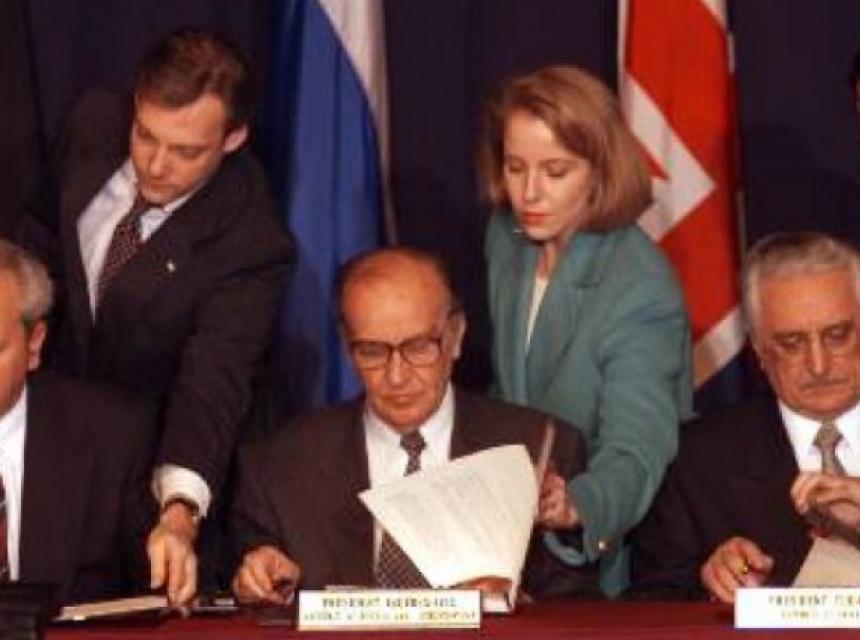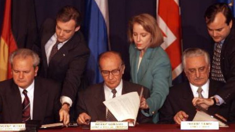 Sporazum su, u prisustvu tadašnjeg državnog sekretara SAD Vorena Kristofera (Warren Christopher), potpisali nekadašnji predsjednici BiH, Srbije i Hrvatske - Alija Izetbegović, Slobodan Milošević i Franjo Tuđman.