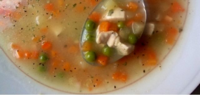 Na malo masnoće kratko propržite isjeckano pileće meso, preko njega sipajte pripremljeno povrće i nalijte sa 2,5-3 litre vode. Dodajte začin za supu, biber, so po ukusu.