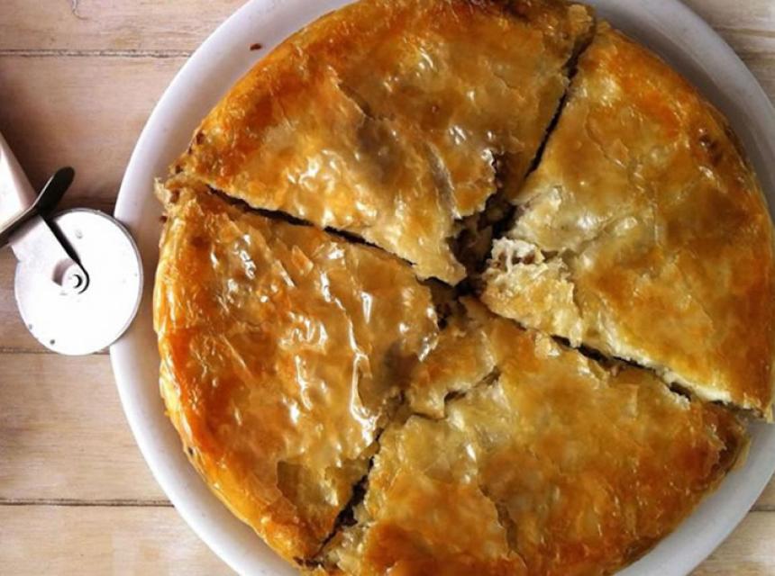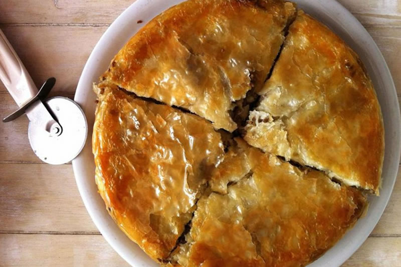 U međuvremenu, luk sitno isjeckamo i popržimo ga na kravljem maslu, pa mu dodamo meso i pržimo ga dok voda ne ispari. Meso ohladimo i ubacimo u njega biber i so i dobro promiješamo. Dublju tepsiju pomastimo, pa jufku na dnu režemo u obliku tepsije pomastimo i po njoj redamo još jufke.