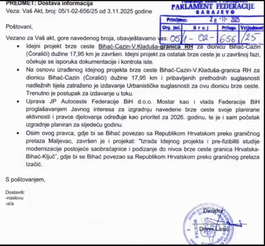 - Uprava JP Autoceste Federacije BiH kao i Vlada Federacije BiH proglašavanjem javnog interesa za izgradnju brze ceste Bihać - Cazin - Velika Kladuša, svoje planirane aktivnosti i pravce djelovanja određuje kao prioritet za 2026. godinu, te je i sam početak izgradnje planiran za sljedeću godinu - naveli su iz JP Autoceste FBiH.