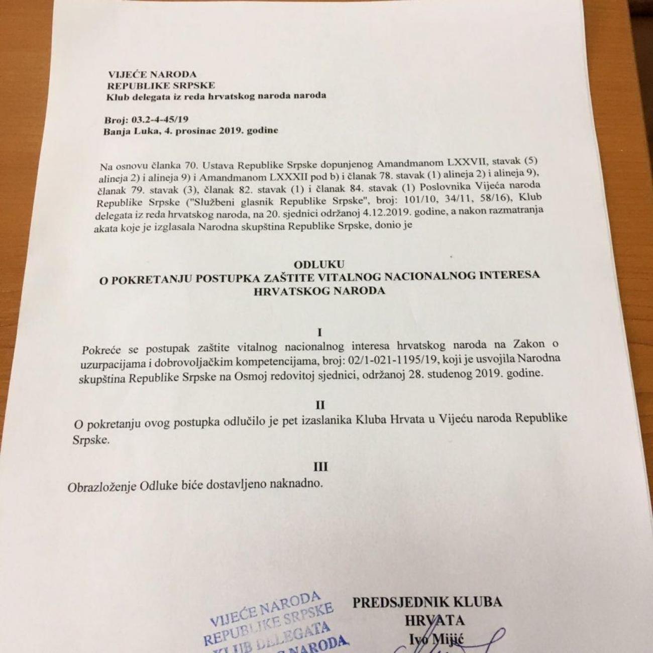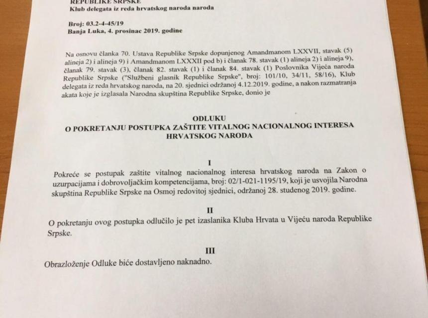 Pet vijećnika u Klubu Hrvata Vijeća naroda Republike Srpske pokrenuli su mehanizam zaštite vitalnog nacionalnog interesa na Zakon o uzurpacijama i dobrovoljačkim kompetencijama kojeg je usvojio entitetski parlament. Riječ je o tri vijećnika HDZ BiH i 2 vijećnika HDZ 1990., dok su troje hrvatskih vijećnika, Nada Tešanović iz SNSD-a, Zdenka Gojković iz Socijalističke partije i Dragana Mikić iz SDS-a, očekivano bili protiv.