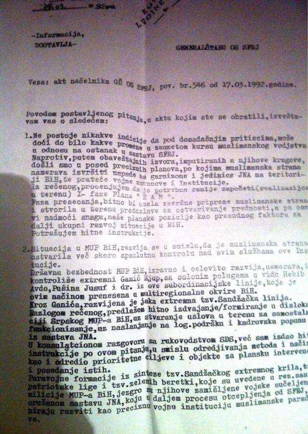 Naprotiv, putem obaveštajnih izvora, imputiranih u njihove krugove, došli smo u posed preciznih planova, po kojima muslimanska strana namerava izvršiti napade na garnizone i jedinice JNA na teritoriji BiH, te prateće vojne ustanove i institucije.