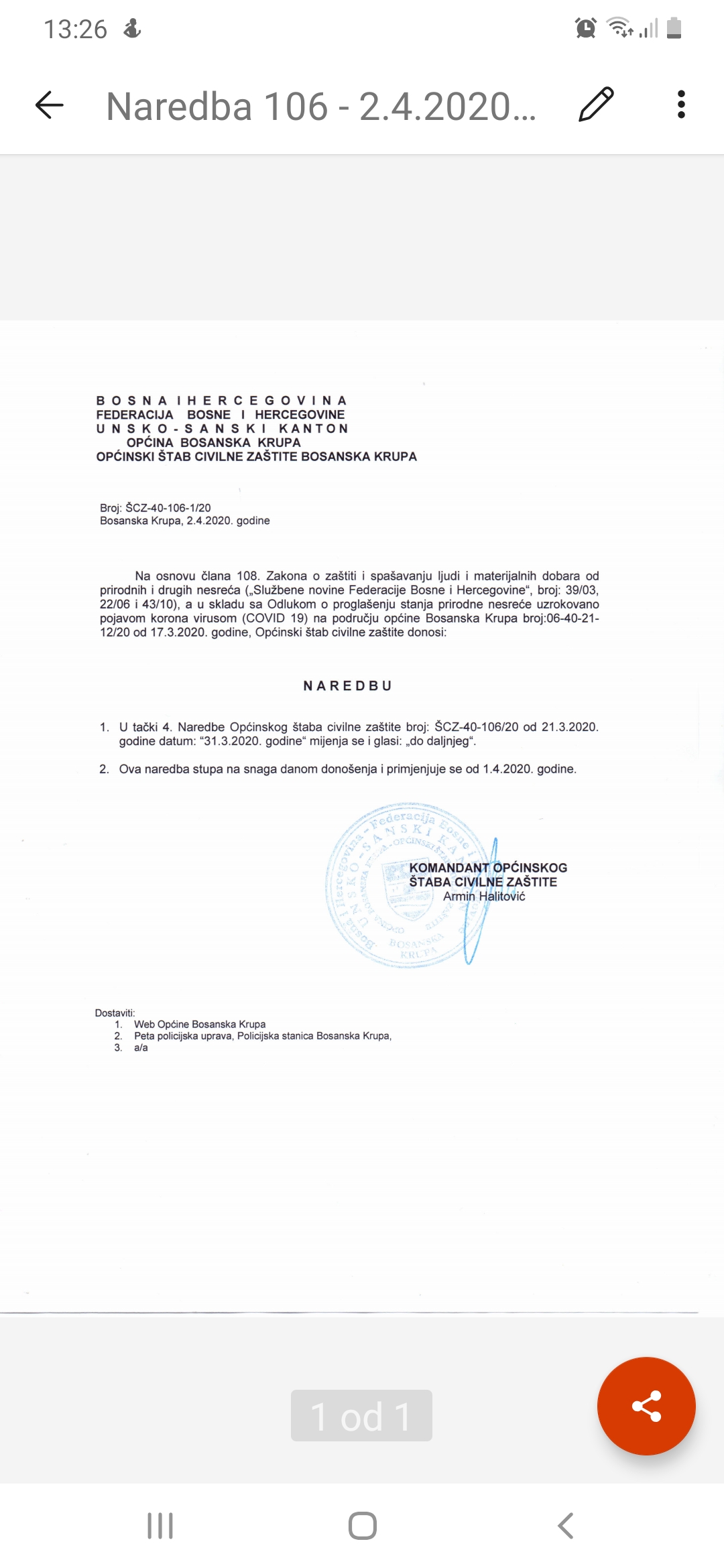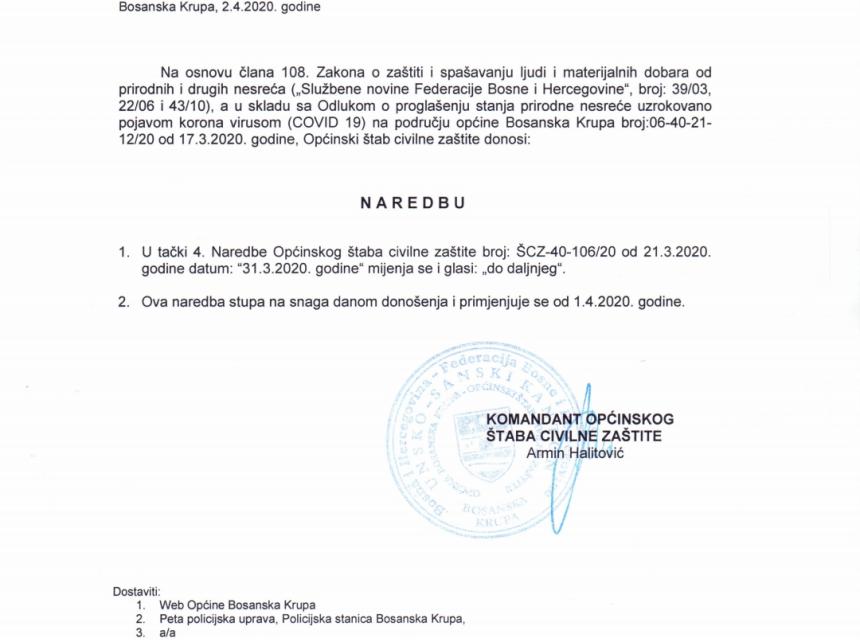 Naime, Općinski štab civilne zaštite je 21. marta donio naredbu o zabrani kretanja na području općine Bosanska Krupa za mlađe od 18 i starije od 65 godina koja je važila do 31. marta. Novom naredbom ova zabrana se produžava i to do daljnjeg.
