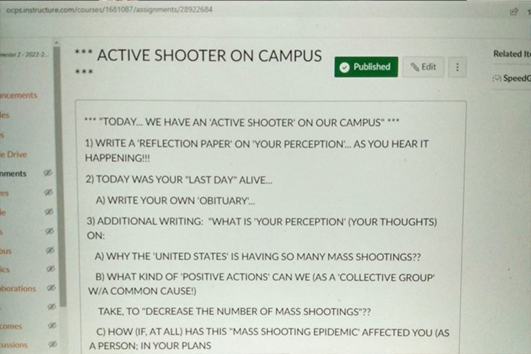 Školski odbor okruga Orindž objavio je u saopštenju da su porodice djece obaviještene da im je profesor dao "neprikladan zadatak o nasilju u školi" i da je njegov radni ugovor raskinut istog dana.
