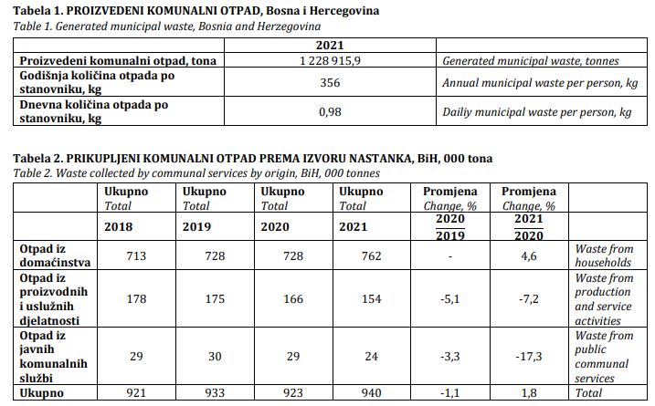 Stanovnik Bosne i Hercegovine proizveo je u prosjeku 356 kilograma komunalnog otpada u 2021. godini. U 2021. javnim odvozom je prikupljeno 940.405 tona