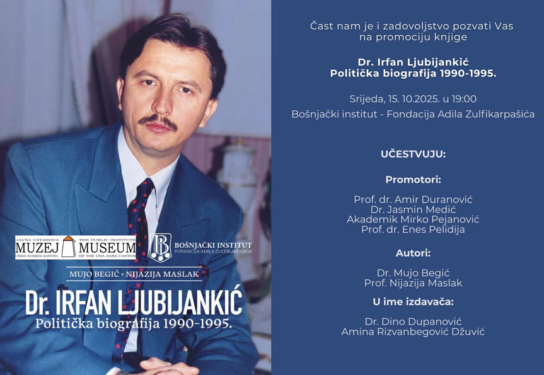 U prepunoj sali Bošnjačkog instituta „Adil-beg Zulfikarpašić“ u Sarajevu, večeras je održana promocija knjige „Dr. Irfan Ljubijankić – Politička biografija 1990–1995“, autora prof. dr. Muje Begića i profesora Nijazije Maslaka.