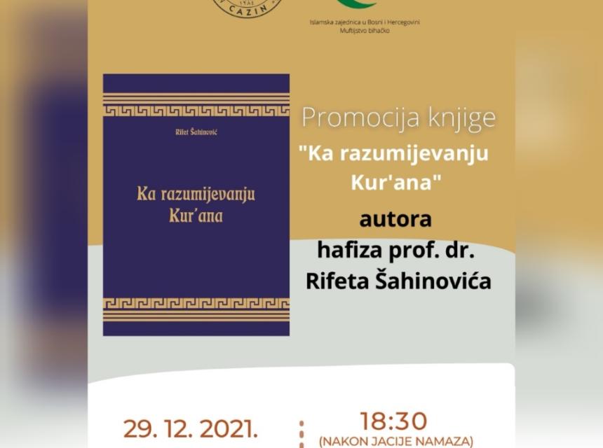 Promocija knjige „Ka razumijevanju Kur'ana“ autora hafiza prof. dr. Rifeta Šahinovića održat će se 29.12.2021. u 18:30 sati u amfiteatru Medrese „Reis Džemaludin-ef. Čaušević“. Ovo novo djelo uvaženog alima donosi nam uvid o njegovim promišljanjima o velikim temama kao što su ljudsko znanje, tumačenja Kur'ana, vjera i vjerovanje, čovjek i društvo, Bosna i Bošnjaci te teologija prirode.