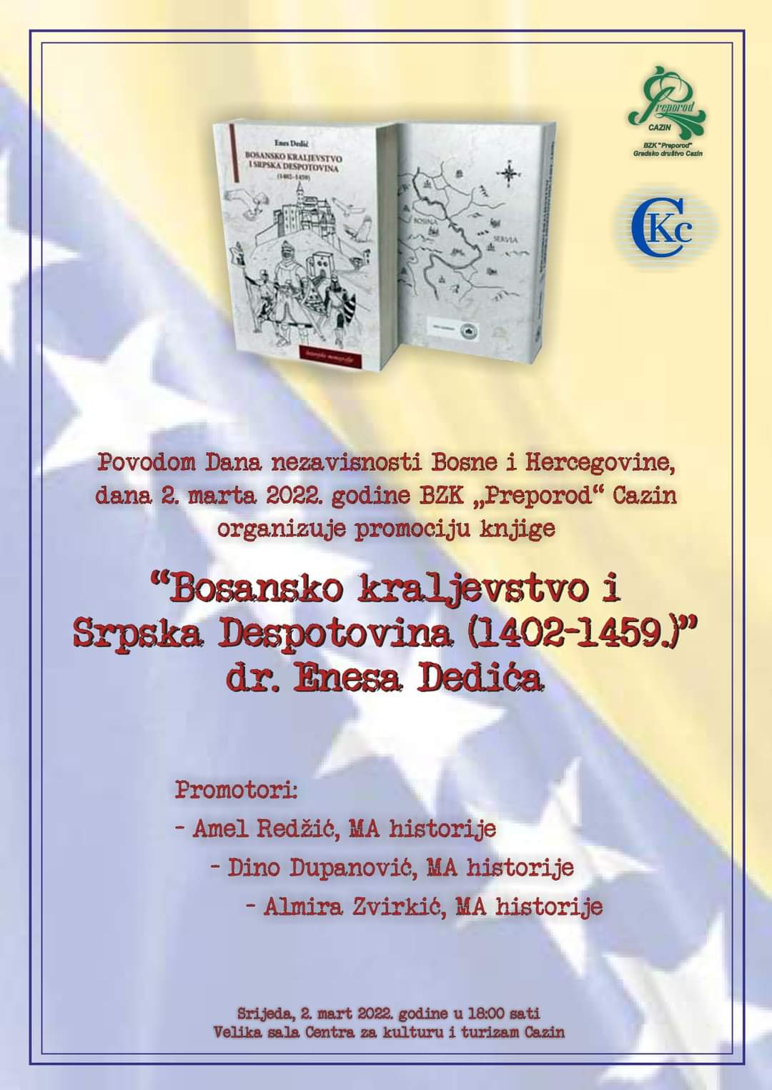 U povodu obilježavanja Dana nezavisnosti BiH, BZK "Preporod" Cazin organizira promociju knjige pod nazivom "Bosansko kraljevstvo i Srpska Despotovina (1402-1459)."